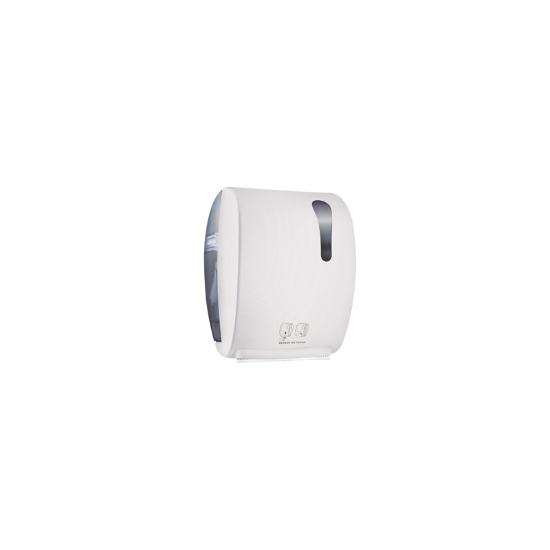 Dispenser in ABS ad erogazione con rilevatore di prossimità e trascinamento elettronico (funziona con 4 pile D). Capacità max bobina asciugamani: H220mm -Ømax 200mm. Meccanismo regolabile: lunghezza di strappo, ritardo tra un'erogazione e l'altra e range del sensore. Come funzione: l'utente, avvicinando le mani al dispenser, attiva il rilevatore di prossimità. Il rilevatore mette in azione il trascinamento elettrico del rotolo (nr. 3 regolazioni di lunghezza da 25, 35 e 45 cm.): L'utente si ritrova un lembo da tirare verso di se, che si taglia con un seghetto nascosto e protetto sotto il coperchio del dispenser.