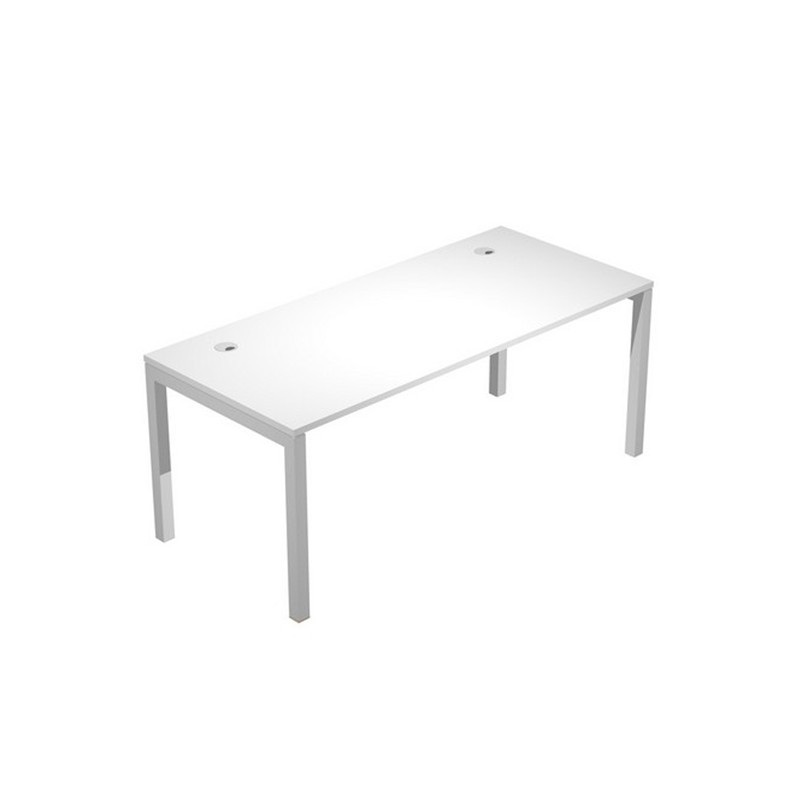 Scrivania per postazione singola dimensioni: L160 x P80 x H74,6cm. Le scrivanie per postazione singola o multipla, sono in bilaminato nobilitato melaminico conforme alle norme UNI e EN classe E1, antigraffio ed antiriflesso, hanno sp. 25 mm con bordo sp. 2 mm in ABS resistente agli urti. Sono caratterizzate da robuste gambe a ponte in metallo a sezione quadrata (50 x 50 mm) verniciate a polveri epossidiche nel colore grigio alluminio, complete di piedini regolabili in altezza.