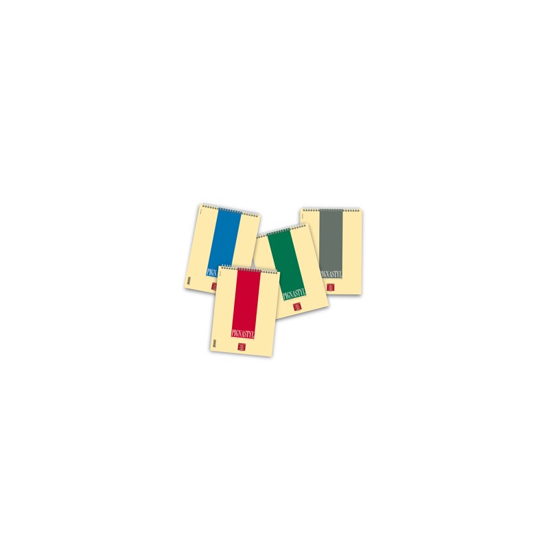 Blocco spiralato sul lato corto. Copertina goffrata da 200gr. Cartone di fondo pesante da 600gr. Formato A4-21x29,7cm. Rigatura 1 rigo. 60 fogli da 80 gr.