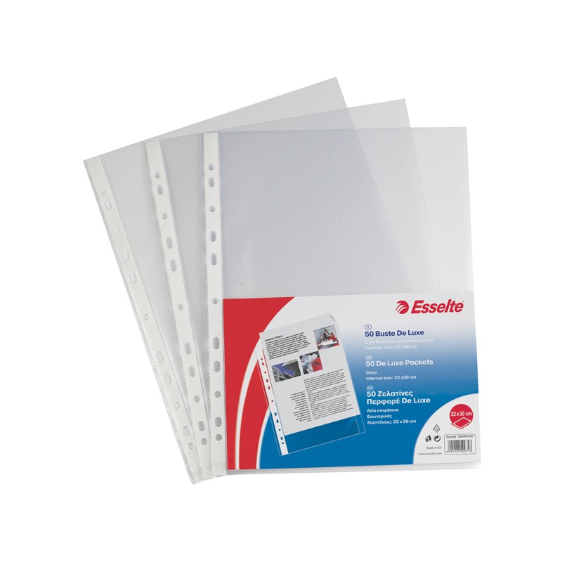 Buste forate realizzate in polipropilene trasparente ad elevata resistenza con foratura universale. formato 22x30cm - liscio. Confezione da 50 buste.