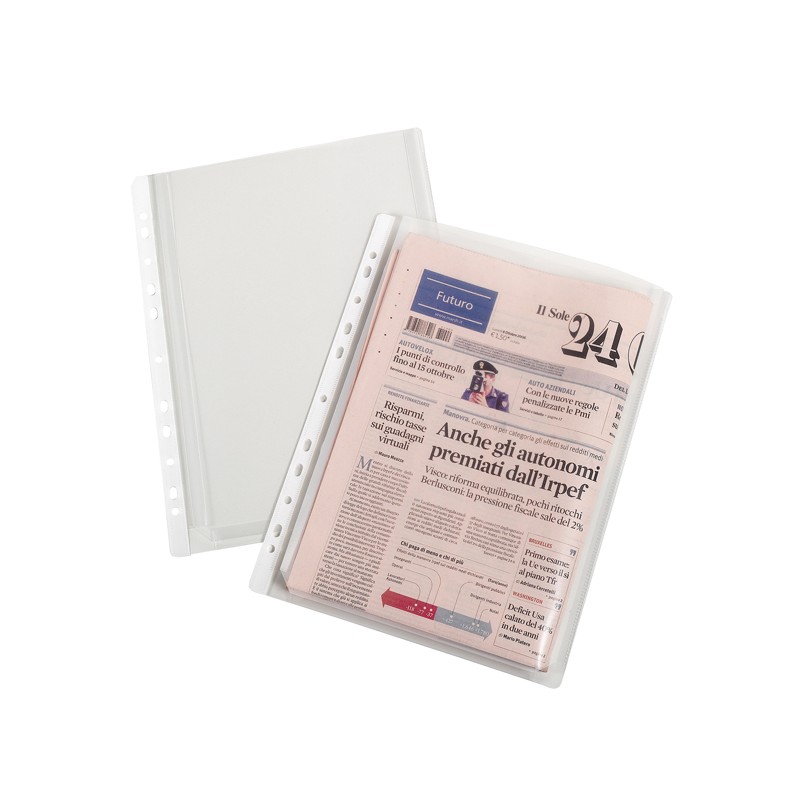 Buste a foratura universale realizzate in polipropilene con finitura a buccia d'arancia anti-riflesso. Soffietto di 2 cm. di larghezza con apertura dall'alto. Possono contenere fino a 200 fogli A4. Ideali per l'archiviazione di quotidiani, cataloghi, riviste. Modello Top.