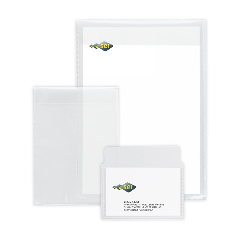 Buste in polipropilene liscio, alto spessore, con patella. Adatte a contenere tessere, documenti, fotocopie, istruzioni, carte di credito e biglietti da visita. Formato contenuto: 100x135mm.