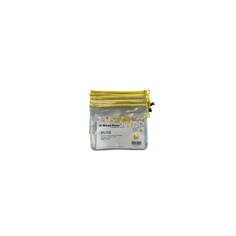 Busta STARLINE in robusto PVC a rete con cerniera di colore giallo. Ideale per documenti e piccoli oggetti. Caratteristiche di questo prodotto: Codice: STL7310 Tipologia di prodotto: Buste con cerniera per vari utilizzi Formato utile: A5 Formato esterno: 20x25cm Spessore: 0,30mm Resistenza alla trazione: =>350g/m2 Confezione da 5 buste