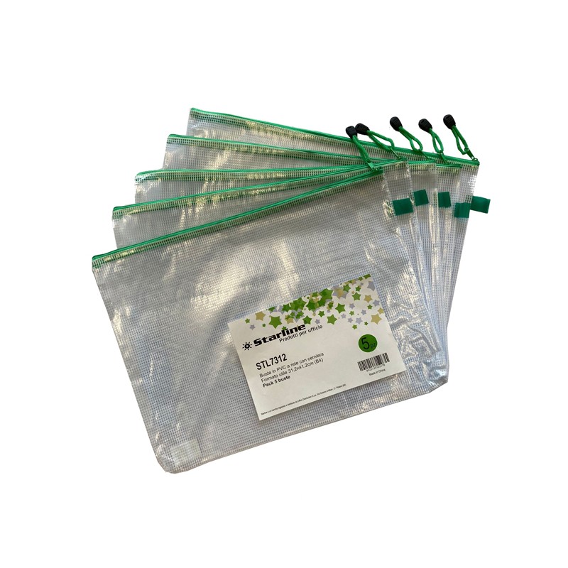 Busta STARLINE in robusto PVC a rete con cerniera di colore verde. Ideale per documenti e piccoli oggetti. Caratteristiche di questo prodotto: Codice: STL7312 Tipologia di prodotto: Buste con cerniera per vari utilizzi Formato utile: B4 Formato esterno: 31,2x41,2cm Spessore: 0,30mm Resistenza alla trazione: =>350g/m2 Confezione da 5 buste