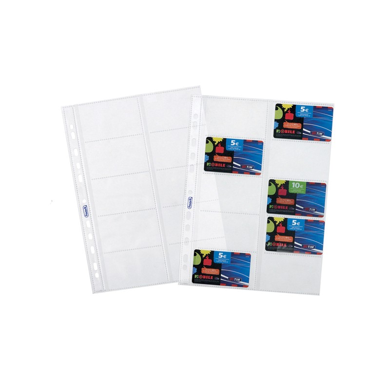 Busta a foratura universale porta cards- biglietti da visita. Realizzate in polipropilene trasparente superior. Consentono l'archiviazione di schede telefoniche e cards varie e biglietti da visita co ultra protezione. Ideali per collezionismo (evita l'effetto fotocopia). Formato busta 21.5x29.7cm. Contiene 10 tasche con apertura superiore da 8.5x5.4cm. Confezione da 10 buste. Made in Italy