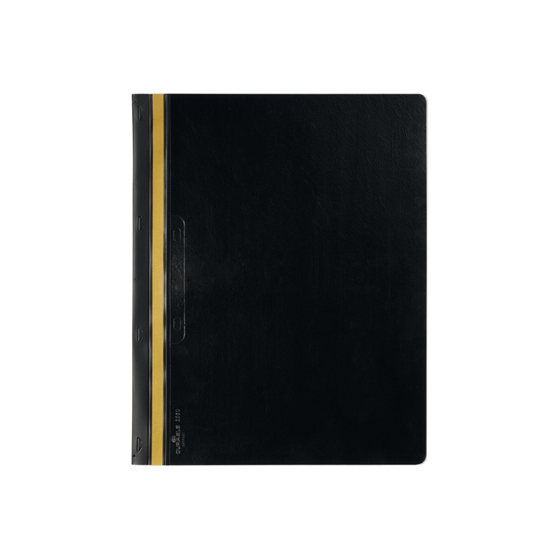 Cartelline nero per rilegatura rapida mediante punti metallici. In PVC con copertina frontale trasparente e posteriore colorata. I punti vengono coperti dalla banda adesiva colorata posta su ambo i lati della cartellina. Dotate inoltre di asole per l'archiviazione in raccoglitori ad anelli. Capacità 1-30 fogli A4. Formato utile: 21x29,7cm.