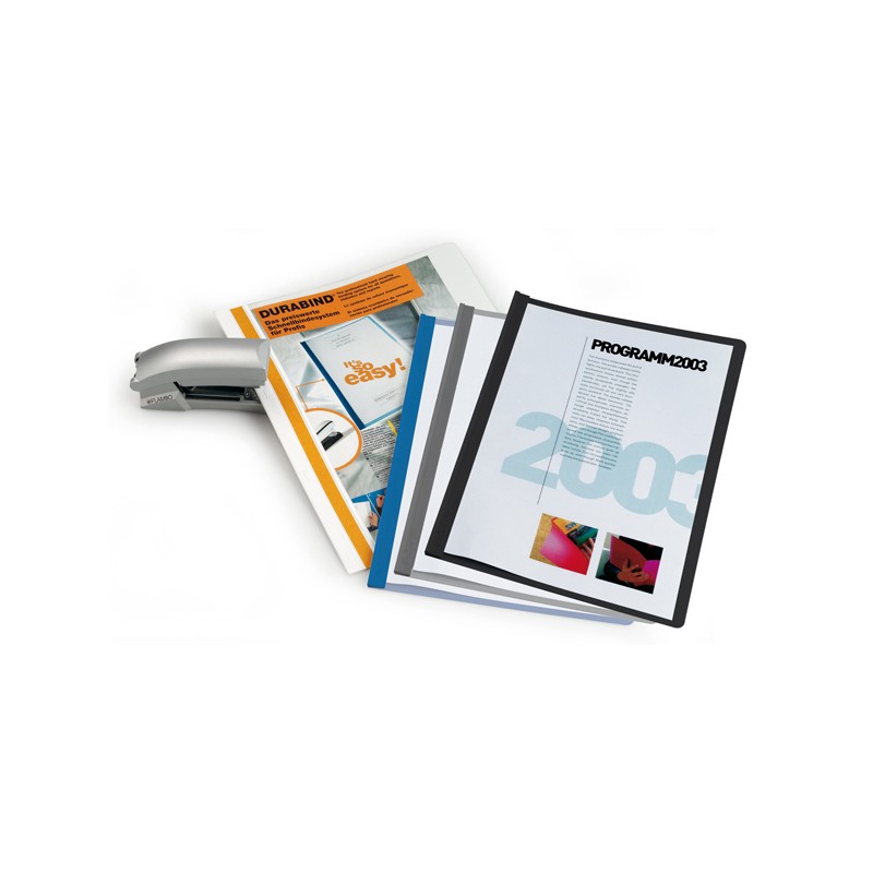 Cartelline azzurre per rilegatura rapida mediante punti metallici. In PVC con copertina frontale trasparente e posteriore colorata. I punti vengono coperti dalla banda adesiva colorata posta su ambo i lati della cartellina. Dotate inoltre di asole per l'archiviazione in raccoglitori ad anelli. Capacità 1-30 fogli A4. Formato utile: 21x29,7cm.