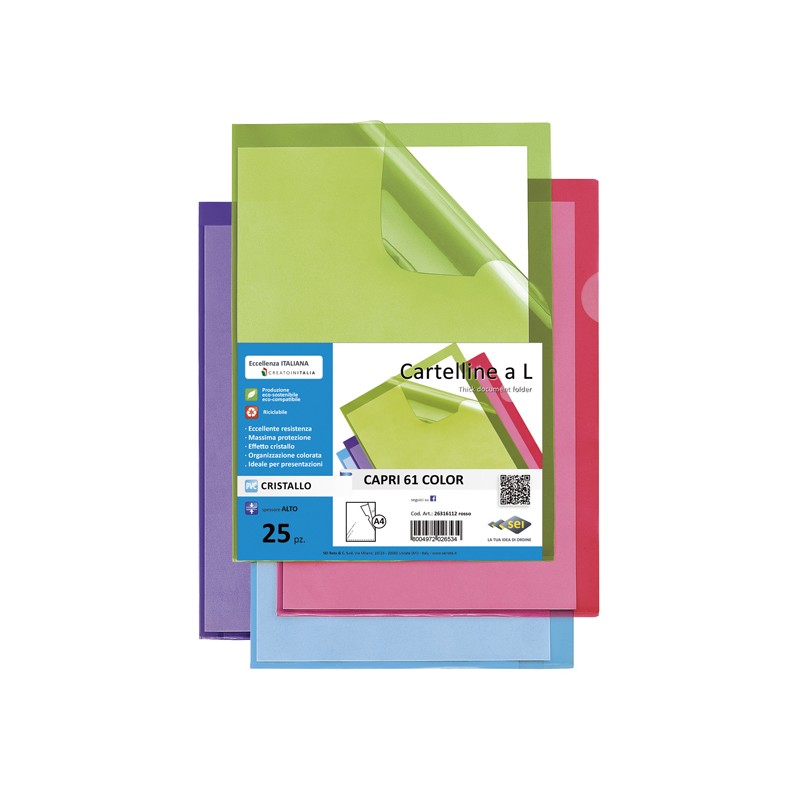 Cartelline in PVC colorato, alto spessore, con apertura a L e lunetta laterale per facilitare l'inserimento o l'estrazione. Ideali per raccogliere fogli e documenti. Non scivolano durante l'archiviazione. Formato interno 210x297mm. Formato esterno 232x322mm. Confezione da 25 cartelline.