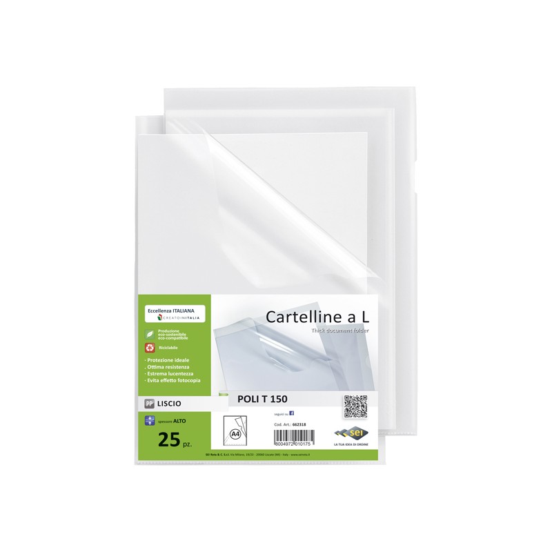 Cartelline in PP trasparente liscio, alto spessore, con apertura a L e lunetta laterale per facilitare l'inserimento o l'estrazione. Ideali per archiviare fax, fotocopie e documenti di facile consultazione. Formato interno 210x297mm. Formato esterno 232x322mm. Confezione da 25 cartelline.