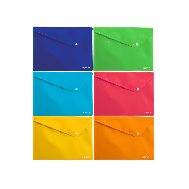 Buste orizzontali in PP con chiusura a bottone e angoli arrotondati. 6 colori assortiti.