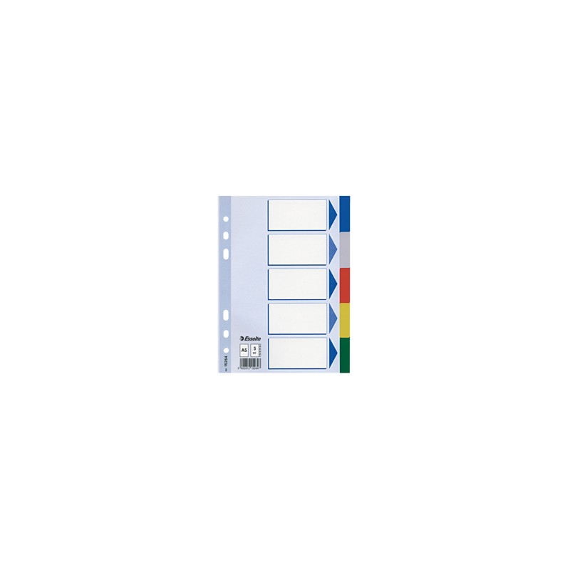 Separatori in Polipropilene colorato dotati di 5 tasti neutri multicolore. Indice frontale prestampato realizzato in cartoncino e rinforzato in Mylar sul lato forato. Perforazione universale. Formato A5.