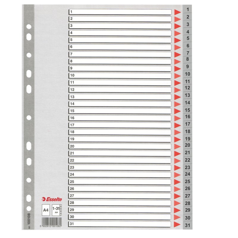 Separatori in PPL Esselte in PPL grigio da 115micron e tasti stampati. Indice frontale prestampato in cartoncino. Foratura universale.