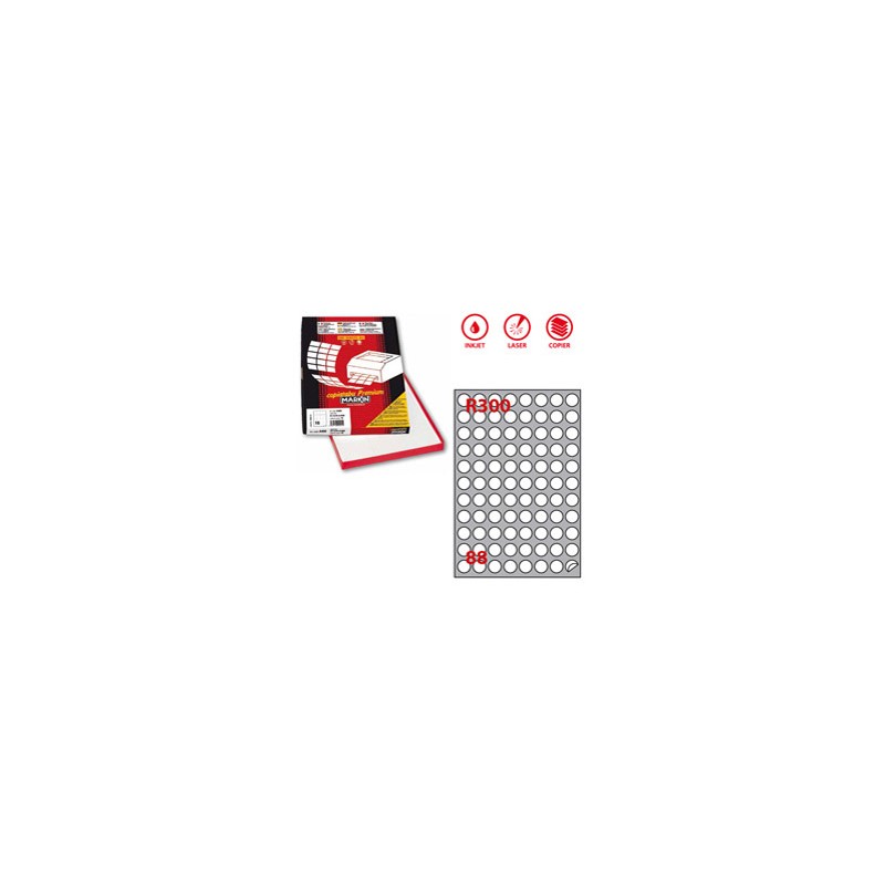 Scatola da 100fogli da 21x29,7cm (A4) di etichette in carta bianca adesive permanenti nel formato. Stampabili con stampanti inkjet, laser e fotocopiatori. 88 etichette tonde per foglio.