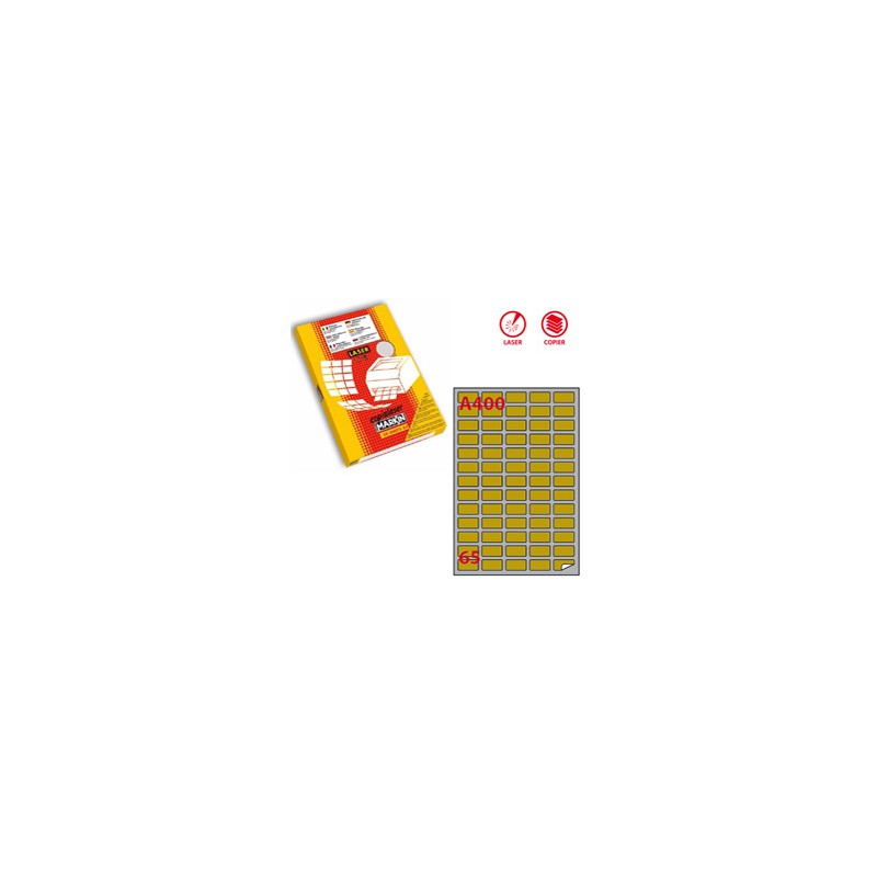 Scatola da 100 fogli A4 di etichette autoadesive permanenti in carta satinata oro. Etichette con angoli arrotondati. Stampabili solo con laser e fotocopy. Dimensioni etichette: 38,1x21,2mm. 65 etichette/foglio.
