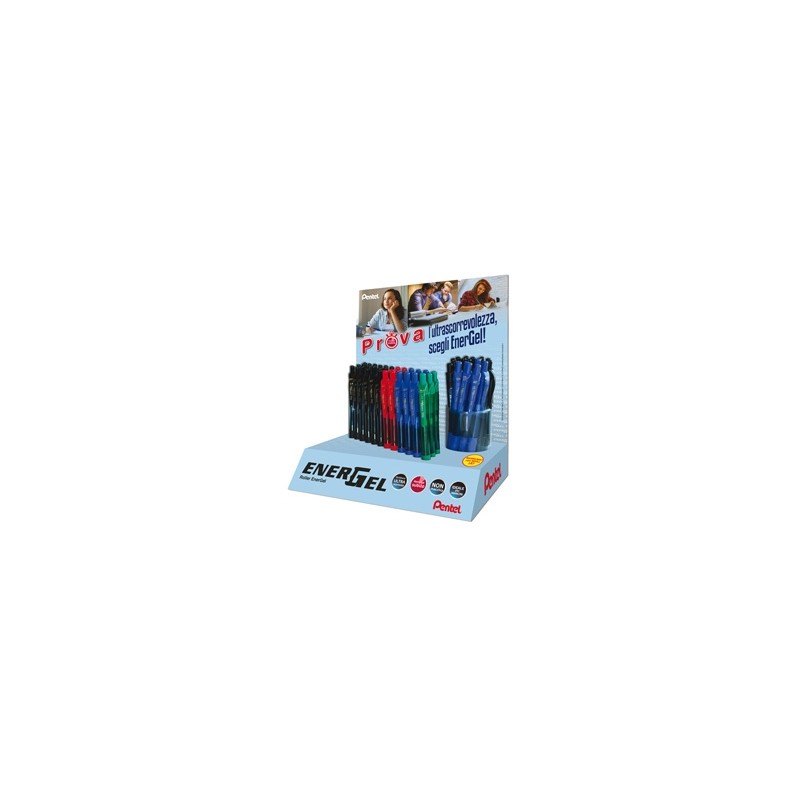 Espositore da banco con 60 roller a scatto punta 0,7mm. Assortimento in 4 colori assortiti: nero(24, rosso(6, blu(24 e verde(6.