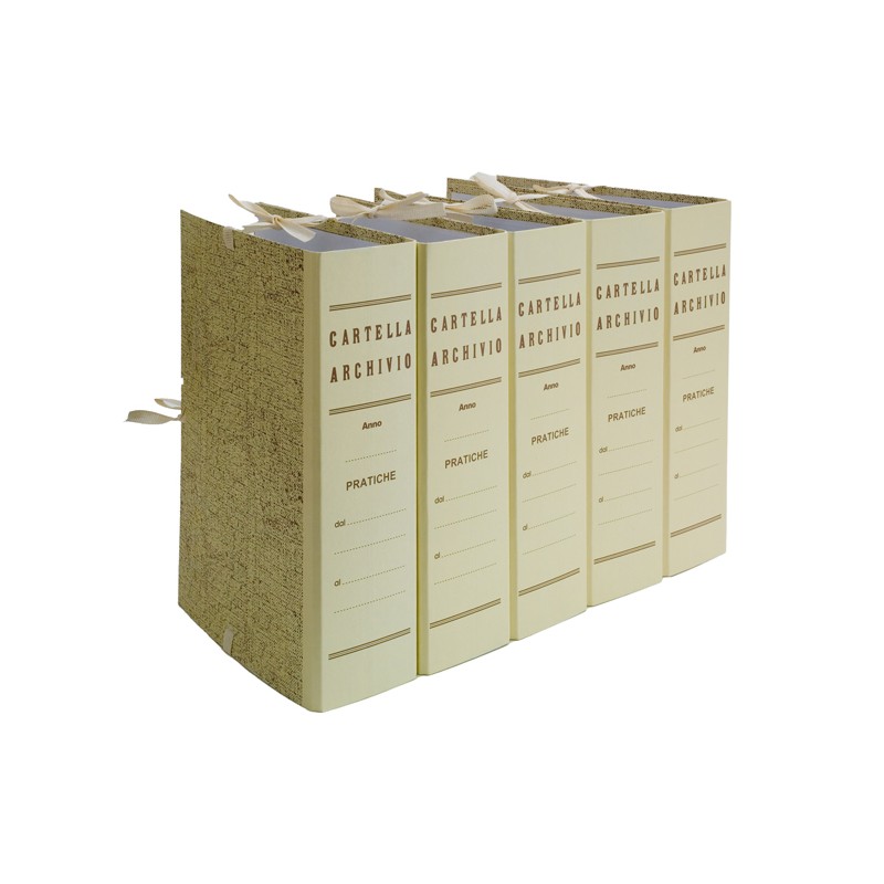 Cartella archivio con 3 legacci incollati. Realizzate in cartone rivestito con carta litografata iuta. Legacci a fettuccia fortemente fissati con collante. Formato 35x25cm. Dorso 4cm. Confezione da 25 faldoni.