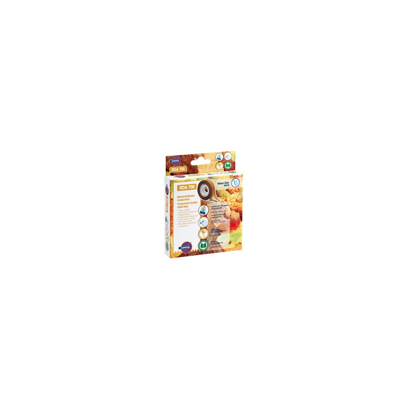 Nastro biadesivo realizzato per il fissaggio di fotografie, campionari, oggetti leggeri, piccoli lavori e laminazioni/accoppiamenti di materiali. Facile da usare. Alta appiccicosità ed adesività per entrambi i lati. Alto allungamento. Performante su differenti materiali e superfici. Lacerabile a mano (secondo il formato prodotto). Adesivo: gomma sintetica e resine, “solvent free”. Adesività lato esterno: 20 N/25mm. Adesività lato interno: 30 N/25mm. Carico/resistenza alla rottura: 100 N/25mm. Colore del nastro: trasparente. Resistenza all'allungamento: 140 %. Resistenza alla temperatura: 60 °C. Tipo supporto: film di BOPP da 28 µm. Spessore totale: 0,098 mm. Tipo e colore del liner: carta avana bisiliconata. KEYWORDS :