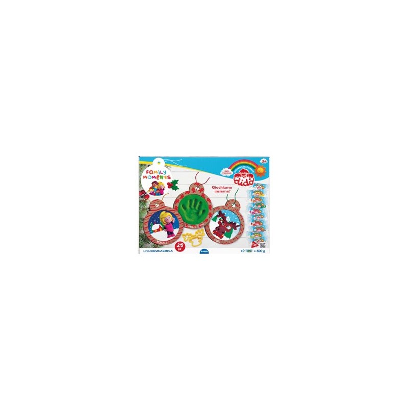 Crea le tue decorazioni natalizie giocando in famiglia. Set composto da: 10 salsicciotti didò, 3 formine casette, 8 dischi con cornice, 1 formina renna, 1 formina albero, 1 mattarello, 1 coltellino.