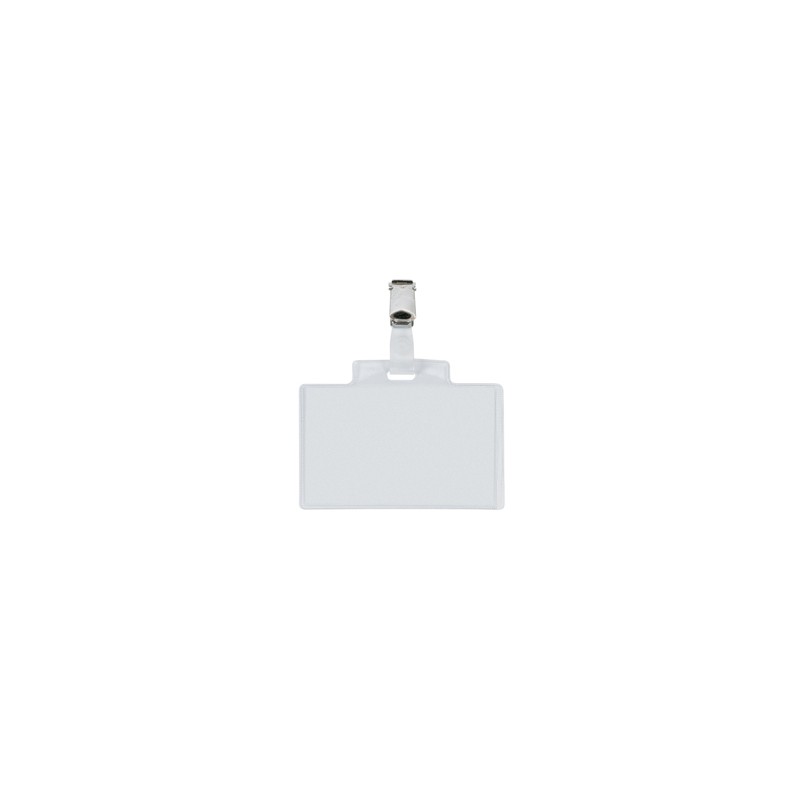 Porta nomi in PVC trasparente, alto spessore, completi di pinzette in metallo e cartoncini. Adatti a congressi, riunioni, visite guidate. Apertura lato corto (laterale). Formato 95x60 mm.