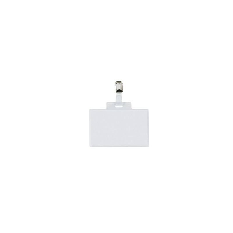 Porta nomi in PVC trasparente, alto spessore, completi di pinzette in metallo e cartoncini. Adatti a congressi, riunioni, visite guidate. Il cartoncino si inserisce dal lato corto. Formato 110x70mm.