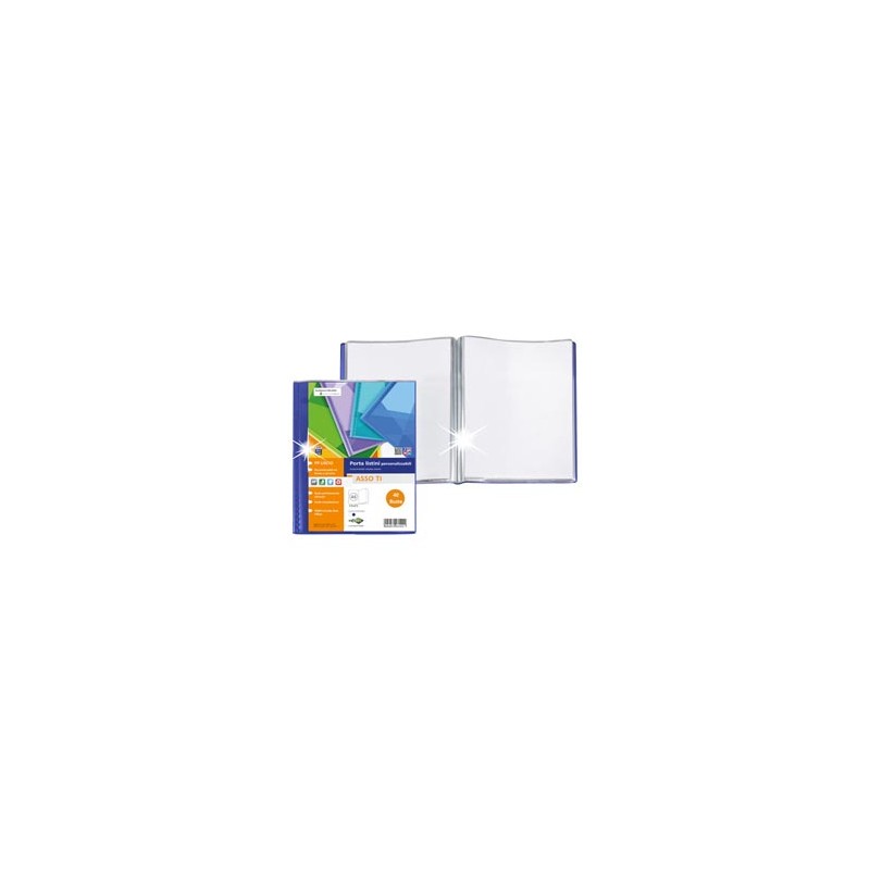 Porta listini A5 a 40 buste in PP liscio, con copertina e retro personalizzabili. Dorso blu. Il perfetto allineamento delle buste e la particolare saldatura facilitano la consultazione. Formato contenuto 150x210mm. Ideale per menù, libretti dei canti etc.