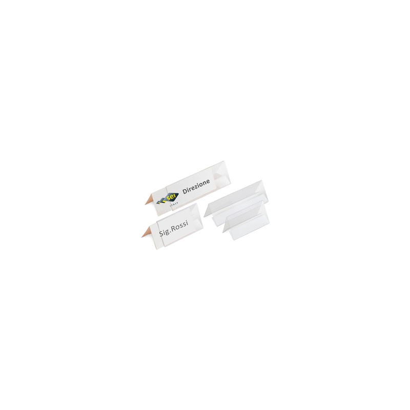 Porta nomi da tavolo in PVC rigido di alto spessore con foglio di etichette stampabili o scrivibili. Adatti a convegni, riunioni, congressi, segna prezzi, targhette identificative. Per mettere sul tavolo nomi e altre informazioni essenziali.