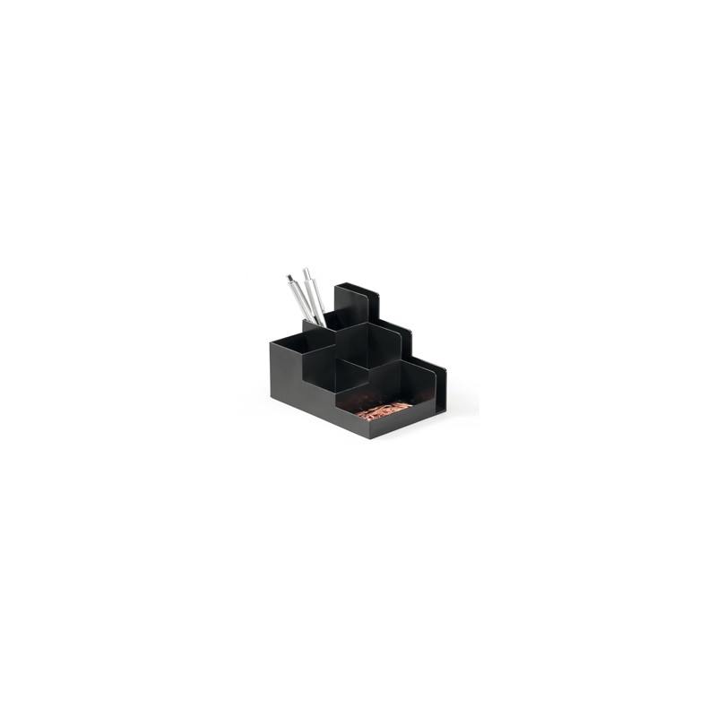 Desk organizer dal design solido e robusto. Dotato di 6 scomparti di diverse dimensioni di cui uno per le buste. Le diverse dimensioni degli scomparti sono adatti a contenere in modo pratico penne, forbici,fermagli, ecc, aiutando così nell'organizzazione dell'ufficio. Prodotta con materiali ecocompatibili secondo lo standard Blue Angel: min. 80% di polistirene riciclato. Dimensioni: 162 x 118 x 110 mm (LxPxH).