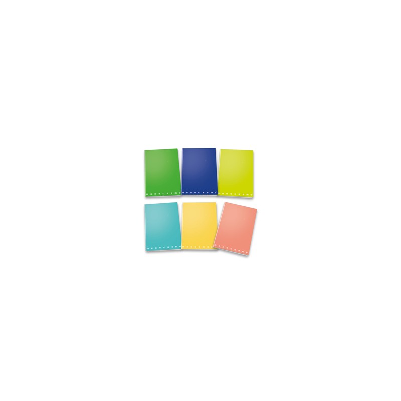 Maxiquaderno prodotto in carta riciclata al 100%. Formato A4. 42 fogli da carta 80gr, cucitura con punto metallico. Assortimento in 6 colori.
