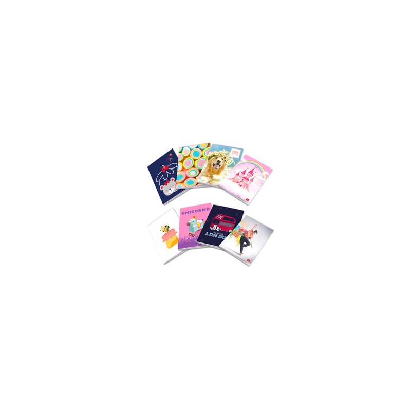 Maxiquaderno rilegato con punto metallico. Copertina in cartoncino da 205gr verniciatura UV. Risguardo personalizzabile stampato fronte e retro. Fantasie assortite 2023.