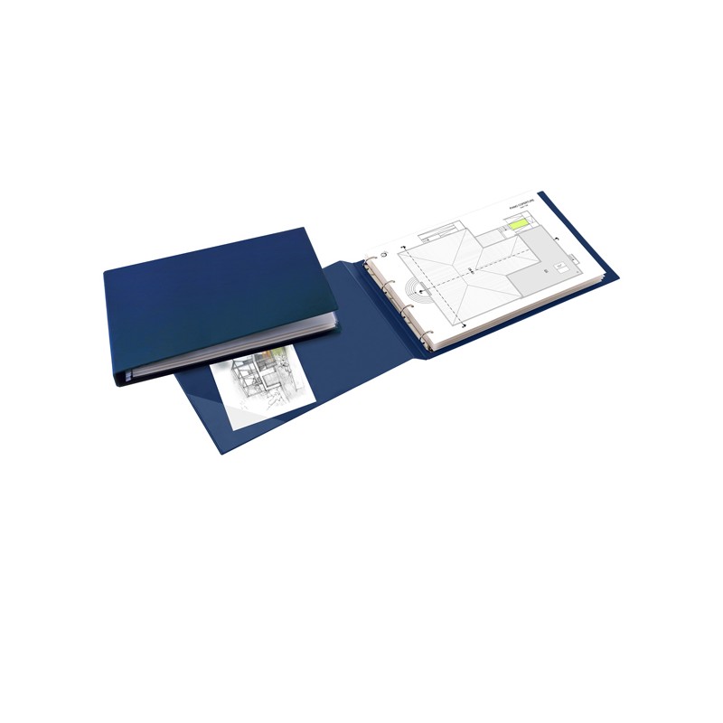 Raccoglitore in Colpan 2000® (cartone rivestito in PVC espanso), spessore 1 mm, con meccanismo a 4 anelli (a D) e tasca interna trasparente. Adatto a contenere documenti, disegni, poster, cartine geografiche, cartelli pubblicitari, stampe. Destinato a durare nel tempo. Formato esterno: 480x315 mm. Formato contenuto: 420x300 mm (A3 album, anelli sul lato corto). Dorso: 40 mm. Diametro anelli: 25 mm. Colore blu.