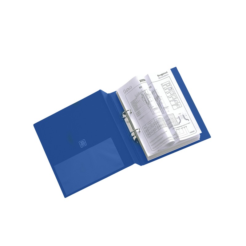 Raccoglitore in Colpan® (cartone rivestito in PVC) con meccanismo a 2 anelli (a D) e tasca interna trasparente. Ideale per archiviare qualsiasi tipo di documento. Formato esterno: 280x310 mm. Formato contenuto: 220x300 mm (A4). Dorso: 55 mm. Diametro anelli: 40 mm. Colore blu.