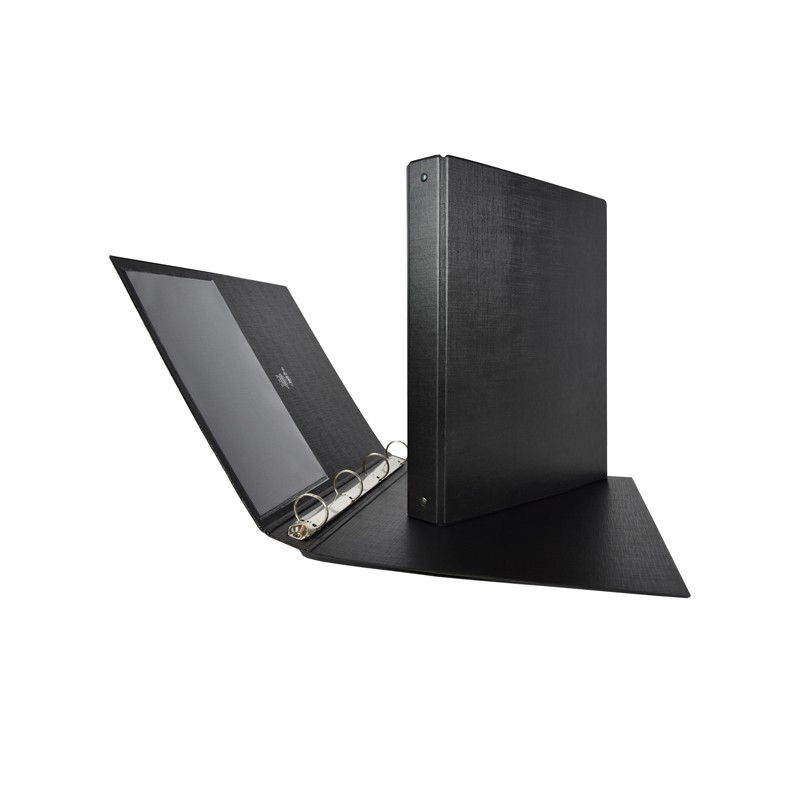 Raccoglitore in Colpan® (cartone rivestito in PVC) con meccanismo a 4 anelli tondi e tasca interna trasparente. Utili in ufficio, a scuola e a casa. Formato esterno: 265x310 mm. Formato contenuto: 220x300 mm (A4). Dorso: 30 mm. Diametro anelli: 25 mm. Colore nero.