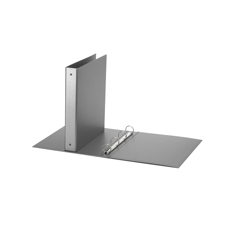 Raccoglitore realizzato in polipropilene con anima di cartone. Texture goffrata "Europa" per chi ama l'eleganza. Elevata resistenza per un uso quotidiano molto intenso a casa e in ufficio. Meccanismo a 4 anelli tondi (diametro 30 mm). Formato utile 22x30 cm. Formato esterno 27x32 cm. Colore grigio metallizzato. Made in Italy.