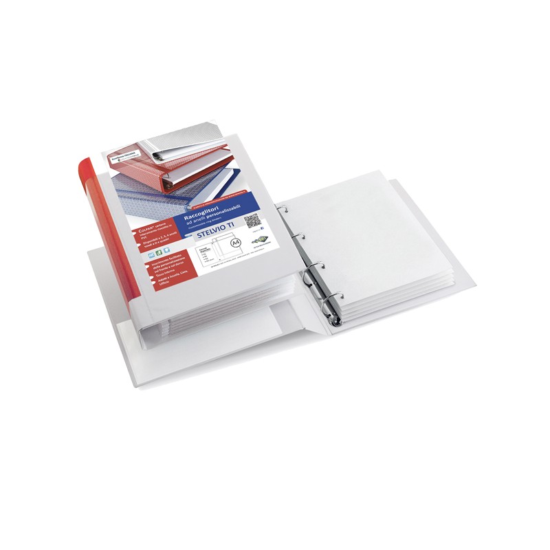 Raccoglitore personalizzabile in Colpan® (cartone rivestito in PVC) con tasca interna e meccanismo a 4 anelli (a D). Tasche trasparenti sul 1° quadrante e sul dorso che consentono l'inserimento facilitato della personalizzazione. Formato esterno: 260x310 mm. Formato contenuto: 220x300 mm (A4). Dorso: 40 mm. Diametro anelli: 30 mm. Colore bianco.