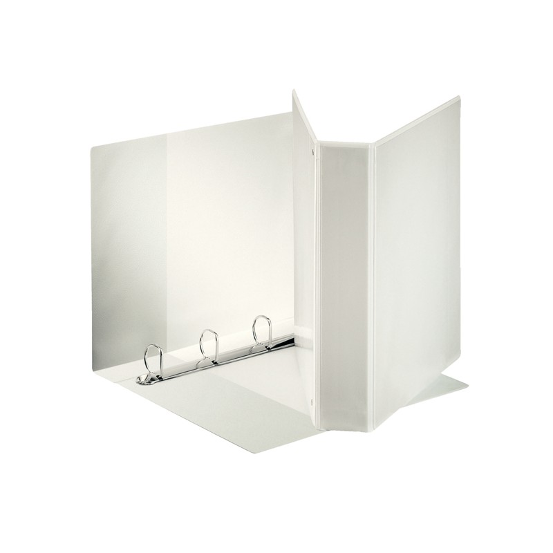 Raccoglitore display formato Maxi, in cartone da 2 mm rivestito in polipropilene eco-compatibile con finitura tipo pelle. Il rivestimento, incollato su entrambi i lati e saldato ai bordi, garantisce un prodotto di qualità eccellente. Il formato del raccoglitore consente di inserire indici e intercalari in formato Maxi per ospitare buste a perforazione universale. La personalizzazione è resa agevole da tre tasche esterne, mentre due tasche interne permettono di contenere fogli sparsi e appunti. Meccanismo a 4 anelli (a D, altezza 50 mm). Formato utile: 22x30 cm (A4). Dimensioni: 270x350x50 mm. Capacità: 480 fogli A4 (80 gr/mq). Colore bianco.