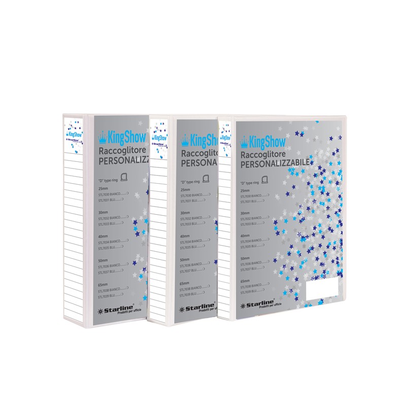 Raccoglitore STARLINE rivestito in polipropilene finitura goffrata, con tasca trasparente interna per appunti e meccanismo a 4 anelli (a D). Personalizzabile sul fronte e sul dorso. Contiene documenti formato A4. Caratteristiche di questo articolo: Codice: STL7032. Modello: Raccoglitore personalizzabile KingShow. Colore: bianco. Formato anelli: a D (altezza 30 mm). Formato utile (LxH): 220x300 mm. Confezione: 1 pz.