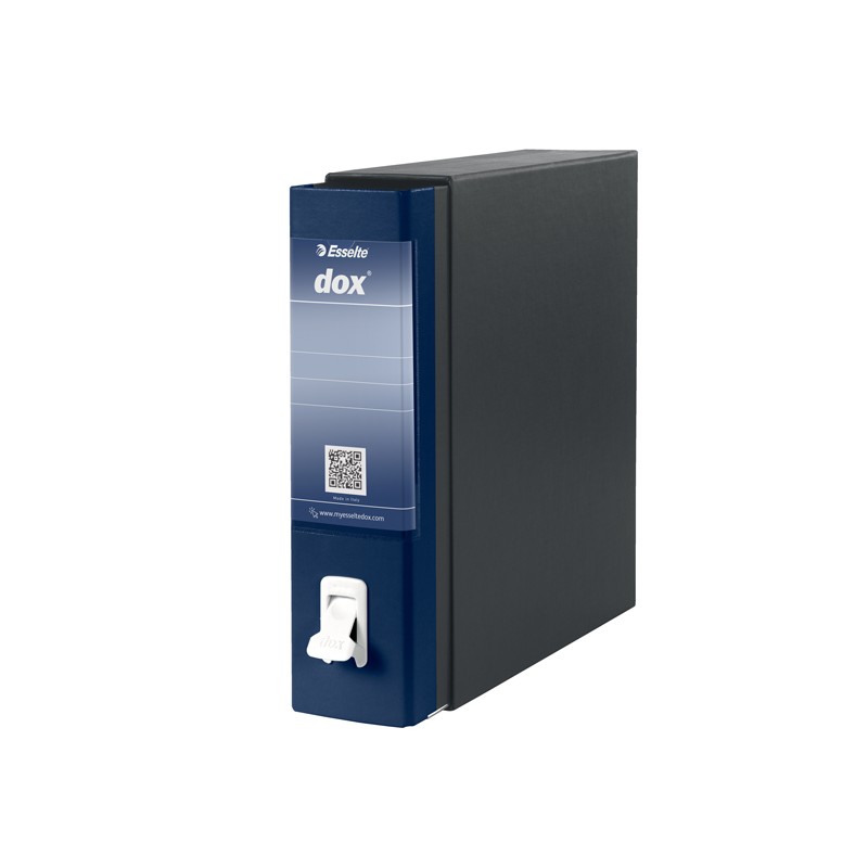 Registratore Dox® 1 dotato di linguella per l'estrazione a scomparsa 3 volte più resistente, caratterizzata da un design con presa più ergonomica, più agevole e arrotondata (l'area rientrante suggerisce il gesto per estrarre correttamente). Struttura in cartone rivestito con carta goffrata antimpronta e rifinito con paralati metallici alla base della plancia. Custodia in fibrone rivestito con carta nera goffrata trattata antimpronta, interno nero e parabordi verniciati. Meccanismo a leva in acciaio nichelato con pressino. Dorso in materiale plastico colorato e portaetichette trasparente con etichetta reversibile. Ogni dox possiede al suo interno un volantino con il codice QR da applicare sull'etichetta e 3 semplici indicazioni per scaricare la app dedicata su App Store e Google Play. Dox infatti si trasforma in registratore intelligente grazie a mydox app, la soluzione facile e immediata per archiviare e reperire documenti (tutte le informazioni sono disponibili sul sito www.myesseltedox.com). Formato commerciale (LxH) 23x29,7 cm. Dorso 8 cm. Colore blu. Dimensioni 85x315x288 mm.
