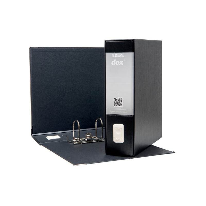 Registratore Dox® 1 dotato di linguella per l'estrazione a scomparsa 3 volte più resistente, caratterizzata da un design con presa più ergonomica, più agevole e arrotondata (l'area rientrante suggerisce il gesto per estrarre correttamente). Struttura in cartone rivestito con carta goffrata antimpronta e rifinito con paralati metallici alla base della plancia. Custodia in fibrone rivestito con carta nera goffrata trattata antimpronta, interno nero e parabordi verniciati. Meccanismo a leva in acciaio nichelato con pressino. Dorso in materiale plastico colorato e portaetichette trasparente con etichetta reversibile. Ogni dox possiede al suo interno un volantino con il codice QR da applicare sull'etichetta e 3 semplici indicazioni per scaricare la app dedicata su App Store e Google Play. Dox infatti si trasforma in registratore intelligente grazie a mydox app, la soluzione facile e immediata per archiviare e reperire documenti (tutte le informazioni sono disponibili sul sito www.myesseltedox.com). Formato commerciale (LxH) 23x29,7 cm. Dorso 8 cm. Colore nero. Dimensioni 85x315x288 mm.