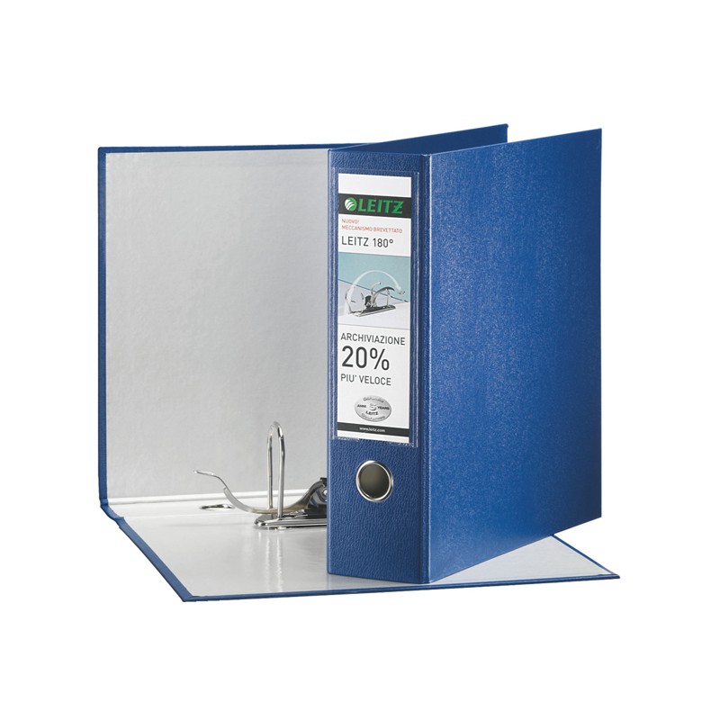 Registratore in plastica con meccanismo brevettato Leitz 180° che rende più facili e rapide le pratiche di archiviazione ed estrazione dei documenti. Rispetto ad un registratore tradizionale, l'apertura del meccanismo risulta infatti più ampia del 50% così che lo svolgimento di tali attività possa essere più veloce del 20%. L’apertura della leva a 180° permette inoltre l’archiviazione dei fogli da entrambi i lati, evitando di dover richiudere il meccanismo per poi riaprirlo ogni volta che si deve inserire un documento nella parte sinistra del registratore. Realizzato in robusto cartone da 2,4 mm, con rivestimento esterno in polipropilene (finitura similpelle) e carta interna plastificata (effetto perlato). Custodia rivestita in carta goffrata con grafica bicromatica. Formato Protocollo (LxH) 23x33 cm. Dorso 8 cm. Colore blu. Dimensioni 85x350x295 mm. KEYWORDS :