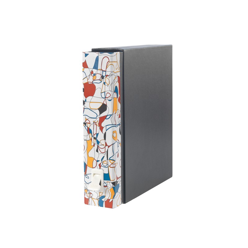 Registratore Dox® 2 dotato di linguella per l'estrazione a scomparsa 3 volte più resistente, caratterizzata da un design con presa più ergonomica, più agevole e arrotondata (l'area rientrante suggerisce il gesto per estrarre correttamente). Struttura in cartone rivestito con carta goffrata antimpronta e rifinito con paralati metallici alla base della plancia. Custodia in fibrone rivestito con carta nera goffrata trattata antimpronta, interno nero e parabordi verniciati. Meccanismo a leva in acciaio nichelato con pressino. Dorso in materiale plastico colorato. Formato protocollo (LxH) 23x34 cm. Dorso 8 cm. Fantasia Infinity. Dimensioni 85x352x288 mm.