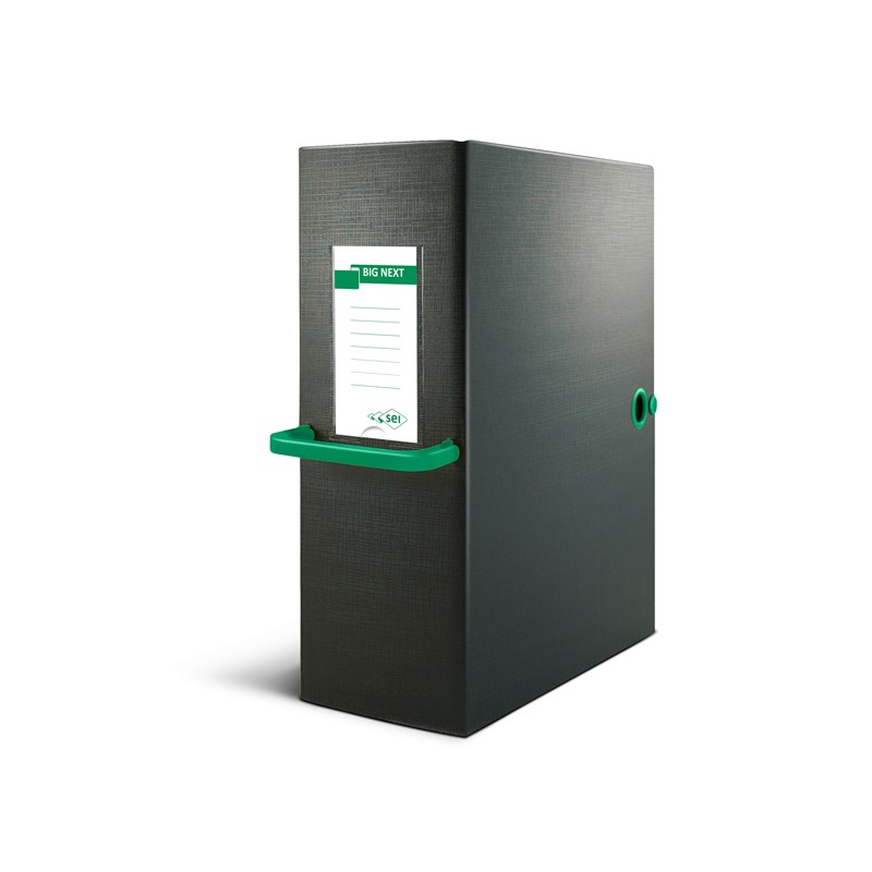 Cartelle in Colpan® nero (cartone rivestito in PVC) con chiusura a tre lembi. Maniglia in plastica verde. Occhiello e bottoni automatici in metallo nel colore della maniglia. Etichetta intercambiabile colorata. Adatte per l'archiviazione e il trasporto di progetti, disegni, documenti e cartelline. Formato esterno: 260x360mm. Formato contenuto:250x350mm. Dorso 12cm.