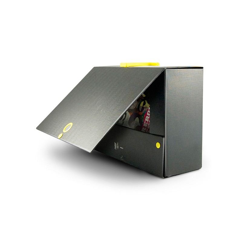 Cartelle in Colpan® nero (cartone rivestito in PVC) con chiusura a tre lembi. Maniglia in plastica blu. Occhiello e bottoni automatici in metallo nel colore della maniglia. Etichetta intercambiabile colorata. Adatte per l'archiviazione e il trasporto di progetti, disegni, documenti e cartelline. Formato esterno: 260x360mm. Formato contenuto:250x350mm. Dorso 20cm.