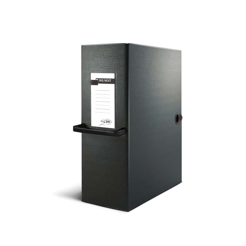 Cartelle in Colpan® nero (cartone rivestito in PVC) con chiusura a tre lembi. Maniglia in plastica nera. Occhiello e bottoni automatici in metallo nel colore della maniglia. Etichetta intercambiabile colorata. Adatte per l'archiviazione e il trasporto di progetti, disegni, documenti e cartelline. Formato esterno: 260x360mm. Formato contenuto:250x350mm. Dorso 20cm.