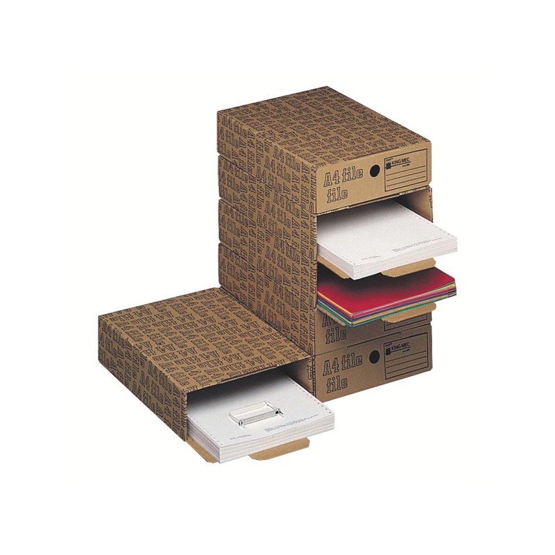 Scatole archivio A4 File struttura in robusto cartone rigido stampato. Componibilità verticale grazie all'inserimento ad incastro delle alette nelle apposite fessure. A4 File con fermaglio metallico capacità 4cm. Formato utile 26x8x35cm. Confezione da 6 scatole .
