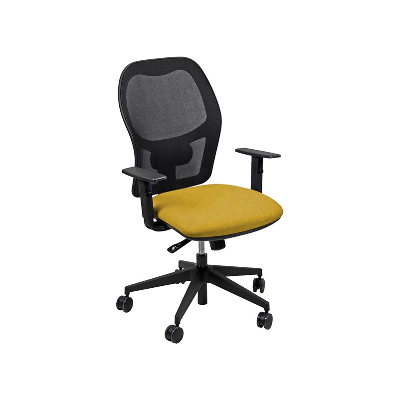 Seduta operativa girevole con elevazione a gas, meccanismo syncro, 4 blocchi anti shock e meccanismo a contatto permanente. Schienale con supporto lombare regolabile. Completa di braccioli regolabili. Rivestimento in tessuto "ECO-Eco" 100% polipropilene. Alt.tot: 102-113cm; Prof.tot: 68cm; Alt.schienale: 60cm; Largh.schienale: 48cm; Largh.sedile: 48cm; Prof.sedile: 46cm; Alt.sedile: 42-54cm.