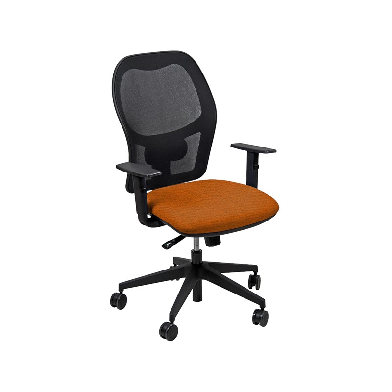 Seduta operativa girevole con elevazione a gas, meccanismo syncro, 4 blocchi anti shock e meccanismo a contatto permanente. Schienale con supporto lombare regolabile. Completa di braccioli regolabili. Rivestimento in tessuto "FASHION - Chili" 75% poliestere riciclato e certificazione di infiammabilità 1IM. Alt.tot: 102-113cm; Prof.tot: 68cm; Alt.schienale: 60cm; Largh.schienale: 48cm; Largh.sedile: 48cm; Prof.sedile: 46cm; Alt.sedile: 42-54cm.