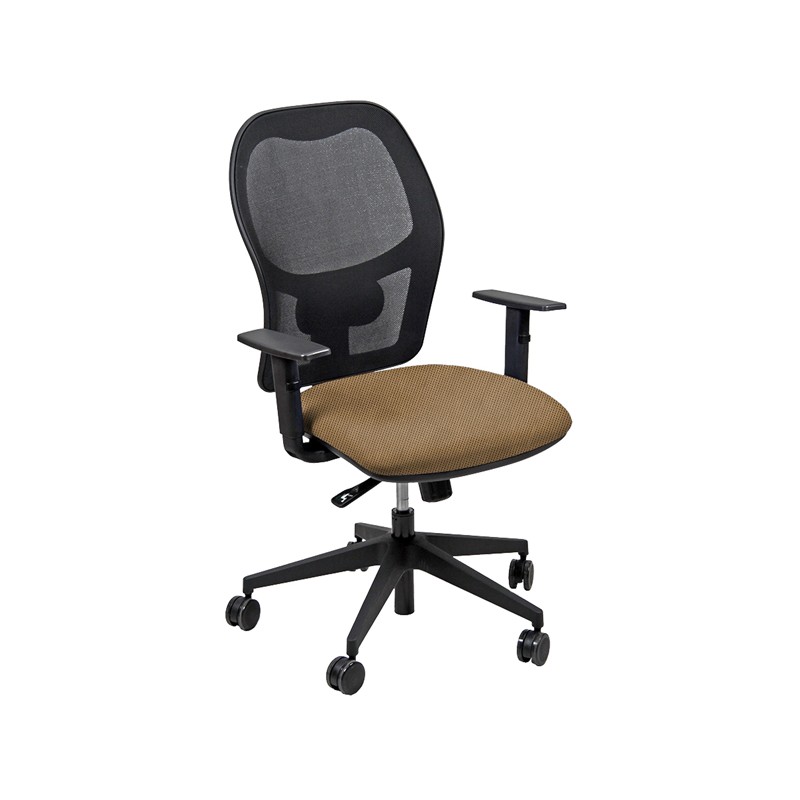 Seduta operativa girevole con elevazione a gas, meccanismo syncro, 4 blocchi anti shock e meccanismo a contatto permanente. Schienale con supporto lombare regolabile. Completa di braccioli regolabili. Rivestimento in tessuto "SUPER - Target" 100% poliestere idrorepellente antimacchia e reazione al fuoco classe 1. Alt.tot: 102-113cm; Prof.tot: 68cm; Alt.schienale: 60cm; Largh.schienale: 48cm; Largh.sedile: 48cm; Prof.sedile: 46cm; Alt.sedile: 42-54cm.