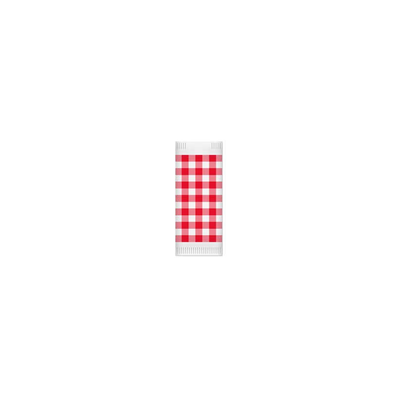 Confezione da 1000 porta posate di carta. Gamma informale in cellulosa decorata per tutti i giorni. Linea Snack Colore: quadretti rossi e bianchi. Idoneo al contatto alimentare.